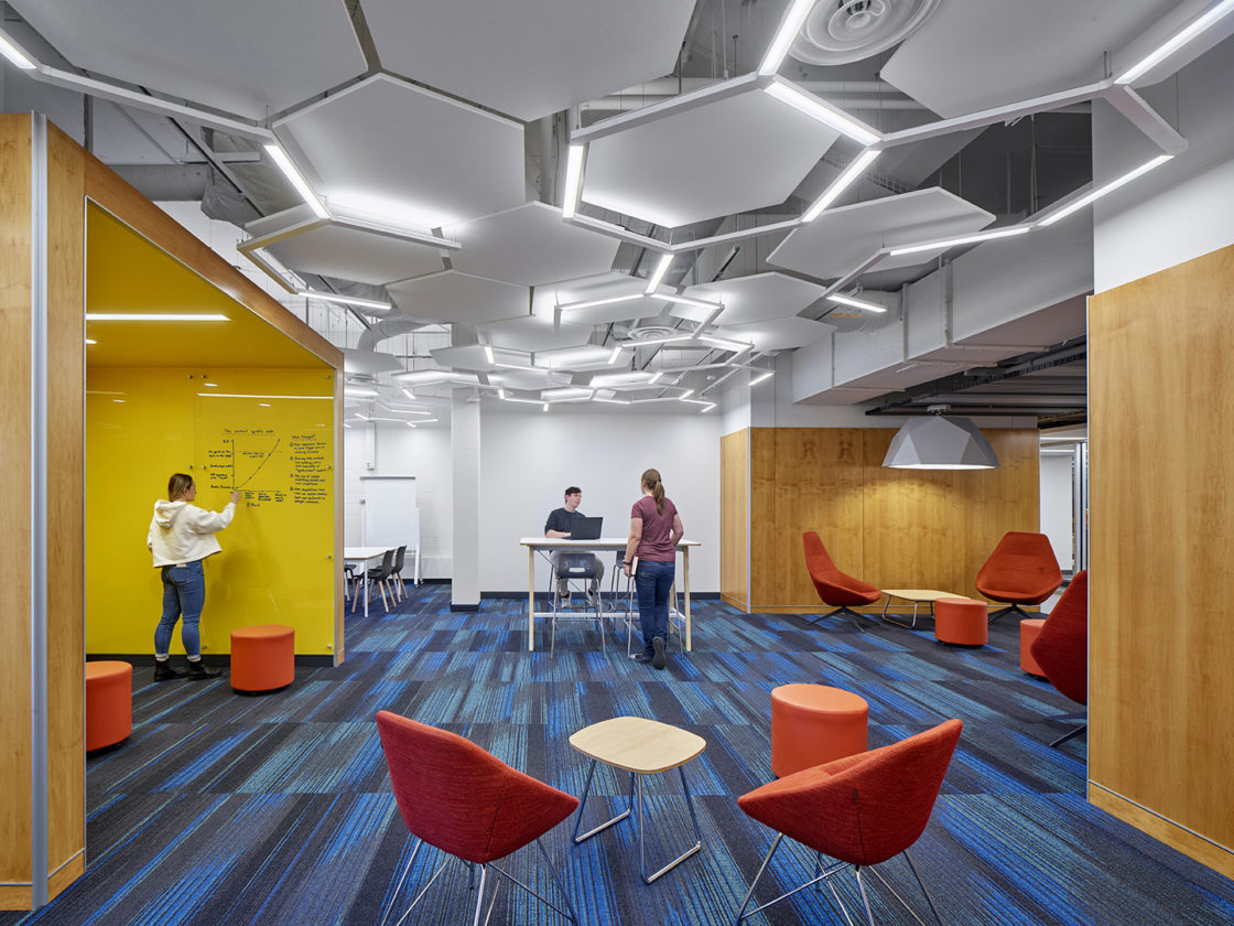 SFA collaborated with MCCC to retrofit an existing 1970’s science building with contemporary STEM and theater programs. A primary goal of the renovation was to dissolve the lengths of the existing block partitions to put learning on display and transform once labyrinthine corridors into spaces for interaction. Our team removed block walls and replaced them with glass to increase visibility in the STEM spaces. We also designed break-out spaces for students to collaborate and gather outside of the classroom. MCCC’s Science Center includes science and engineering teaching labs, a large 350-seat theater, a small black box theater, music practice rooms, classrooms and lecture halls, an engineering fabrication lab, offices, and various support spaces.